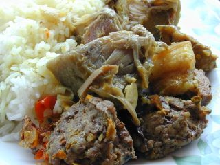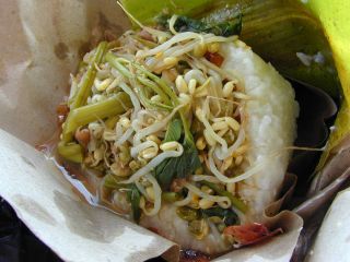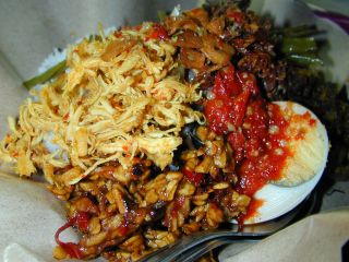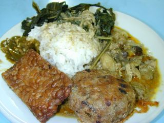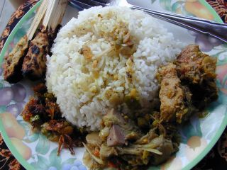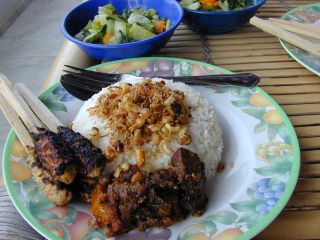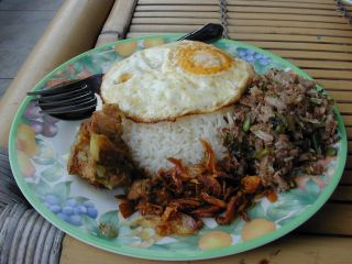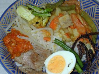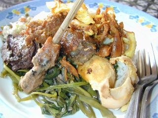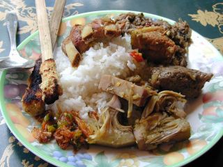 1月13日(月) 朝、ナシチャンプルーを食べる。昼は、みんなでWarun Catuにてご飯を食べる。私は今回もナシチャンプルー。夜は、水底とふたりでパダン屋に行き、そこで食べる。テンペと鶏のカレー煮。美味。 食:8時、ナシチャンプルー、フルーツサラダ。 食:12時、ナシチャンプルー、スイカジュース(Warun Catu) 食:19時、パダンご飯、エステ 1月14日(火) 数日前から、ステイ先の家では15日に向かって家の寺の祭りの準備に忙しい。集落の寺のお祭りもあるのでいつもよりも倍忙しいようである。本日は早朝より男達が料理をする。そこで起き出して、鶏をもも肉から包丁でたたいてミンチにしたり、茹でた豚の顔を刻んだり、野菜を刻んだり、鶏をしめて血を抜いて伝統的な血を混ぜたサラダのラワールメラをつくったり、トゥムと呼ばれる肉と野菜の蒸しもののようなものをつくったりするのを見物する。朝の5時からずっと料理をしていた。そして、朝は遅めで、このラワールを食べさせてもらう。昼は、トゥムや鶏の煮たのをいただく。夜は、水底とナシチャンプルーを食べに行く。先日水底母と行ったところ。本日のは実に辛かったがやはりテンペがおいしかった。水底も気に入る。 食:9時、ナシチャンプルー、フルーツサラダ 食:14時、ナシチャンプルー、フルーツサラダ 食:20時、ナシチャンプルー、エステ(無名)