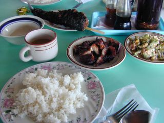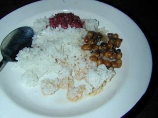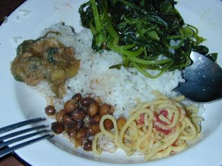 3月1日(土) 雨。暴風雨となる。明日より水底が不在。私はあさってより不在となるので部屋の掃除をする。昨日のカレーにほうれん草とトマト缶とチーズを入れて食べる。 食:14時、カレー、納豆。 食:19時、カレージャッフル。 食:22時、カレー、納豆。 3月2日(日) 晴。水底、早朝醤油かけうどんを食べて外出。私は午前中に新宿まで出て資材を購入。見知らぬ人に人違いを受ける。久しぶりで、元気にしていたかと、某氏は元気かと言う。私はその人にも某氏にも覚えがないのであなたがどこのどなたか知らないと言う。それでもしばらく自分が判らないかと言うので、判らないと言い続けるとあきらめて行った。 もちろん、私は自分の名前を名乗らないし、向こうも私の名前は言わない。町には怪しい人が多い。朝、出かける前にご飯を炊いて、残っていたカレーを食べる。午後、キャベツとさつま揚げと葱で焼きそばをつくり、豆腐と油揚げと白菜と小松菜で湯豆腐をつくって、ビールとともに大量の残り物の一部を消費し、しばらく寝る。ご飯の残りは梅干し海苔おむすびとする。翌早朝に外出。 購入:焼きそば麺。 食:9時、カレー。 食:14時、焼きそば、湯豆腐、ビール、おにぎり。 3月3日(月) 晴れ。フィリピンへ。早朝夏みかんを食べる。実家から届いたもので最初は酸がきつくて食べられたものではなかったが、2カ月も経ち、酸がとれて甘味がでてきた。香りもよく美味。車で外出。午前4時。成田へ。空港で時間を待ちながらおにぎりを食べる。フィリピン航空にてマニラへ。機内食は菜めしとすき焼きに、筍、人参、玉葱が入ったもの、そばとパンとチョコレートまんじゅう。どうして最近はどの航空会社もそばを取り入れるのだろうか。オレンジジュースやお茶や紅茶を飲む。マニラでG氏が迎えてくれる。G氏は北部ルソンの出身で私と同じ年である。チャーターした車で北部ルソンの町ソラノへ向かう。夕食は早めで途中のご飯屋さんにて、豚肉、焼き魚、豚スープ、ゴーヤと卵炒めなどを同乗の4人でシェアして食べる。唐辛子に柑橘のカラマンシーをかけてそれに焼き魚をつけて食べる。マンゴーとバナナを食べる。マンゴーは今が旬で非常においしい。さらに夜、途中の店で、餅菓子やかるかん、バナナの皮でつつんだ蒸し米のお菓子とネスカフェをとり、深夜ホテルに到着。寝る。 食:7時、おにぎり。 食:11時、機内食。 食:17時、ご飯、豚肉、焼魚、ゴーヤと卵の炒め物、豚スープ、マンゴー、バナナ。 食:20時、ネスカフェ、餅菓子、かるかん、蒸し米菓子。 3月4日(火) ソラノから山へ。朝、ホテルでバイキングの朝食。ご飯、目玉焼き、ハム、豚肉などを食べる。スイカとパパイヤを食べる。ネスカフェを飲む。午前中、ソラノの事務所で打ち合わせをして、昼となる。昼は、ソラノのオランダレストランへ行く。そこで、フィリピン料理を食べる。ご飯と揚げ豚と野菜を煮たもの。店のオーナーの年をとったオランダ人がフレンドリーである。午後、長距離バスを乗り継いで山の入口のアローラに到着。そこで、山に住むJ氏に再会し、J氏の兄が運転するぼろぼろのジープで山へと向かう。 夕食は、小豆を少し大きくしたような直訳すると鳩豆と鰯を醤油などで煮たもの。豆がおいしい。 星がきれいだった。 食:8時、ご飯、豚肉、ハム、目玉焼き、スイカ、パパイヤ、ネスカフェ。 食:12時、ご飯、揚げ豚肉、野菜煮、マンゴージュース。 食:20時、ご飯、豆魚スープ。 3月5日(水) 山の1泊目の朝。コンビーフをにんにくと醤油で炒めた物と昨日の豆煮スープ。苗栽培場を建設する作業の撮影。昼は、コンビーフとインスタントラーメンでご飯を食べる。夜は、大根葉のようなものを味噌で煮る。味噌は日本からのおみやげ。味噌の味は違和感がないようである。醤油を使うからかも知れない。昨日の豆スープ、昼のラーメン、それに何かとろりとした野菜のおかずでご飯を食べる。途中さつま芋やバナナやザボンも食べている。風呂に入らず2日目。そろそろつらい。 食:7時、ご飯、コンビーフ炒め、豆煮スープ。 食:12時、ご飯、インスタントラーメン。 食:20時、ご飯、菜っぱの味噌汁煮、豆スープ、インスタントラーメン、野菜のおかず。 3月6日(木) 山の2泊目の朝。昨日の残りでご飯を食べる。作業を撮影。昼、バナナの花をにんにく醤油で炒めたものとご飯。夜は豚足のスープ。煮た豚足といんげんを炒めたもの、豚足の醤油、酢、砂糖、にんにく煮のアドボ、いんげんと菜っぱの味噌煮。ごちそうである。本日で最後。風呂に入らず3日目。もうどうでもいい。ご飯がおいしいのは嬉しいことである。 その頃日本の水底の元に届いた宅配。 宅配:葉玉葱、じゃが芋、小松菜、にら、えのき、キャベツ、ほうれん草、レタス、つぼみ菜、みかん、豆腐、油揚げ、納豆、鶏もも 食:7時、ご飯、菜っぱの味噌汁煮、野菜のおかず。 食:12時、ご飯、バナナの花のにんにく醤油炒め、コンビーフ。 食:20時、ご飯、豚足ア