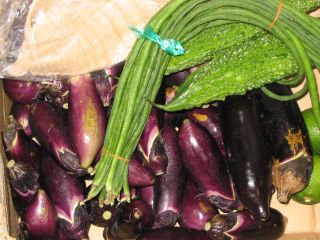 いただきもの:佐土原なすを含むなす3種類、にがうり、長いいんげん、塩竹の子、摘果夏みかん