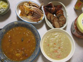 10月19日(日) 晴れ。佐渡。植林を取材。さらに、朝のお弁当も、昨日と同じ業者。もう、何も言うことはない。今日は700円。昼、植林現場でいただいた佐渡産新米のおにぎりとたくあん、塩鱒がおいしかった。その後、植林の打ち上げに参加。夜はカップ麺とおにぎりにビール。体に悪い。 食:6時、お弁当。 食:12時、おにぎり弁当。 食:16時、おにぎり、つまみ、お茶。 食:21時、おにぎり、カップ麺、ビール。 10月20日(月) 晴れ。佐渡で午前中仕事をした後、フェリーに乗り新潟へ。新潟から東京へ夜の関越道を走る。朝は、両津市の喫茶店でサンドイッチ、昼は、牡蠣フライ定食。同じ物ばかり、それほど食べる場所もないのだ。 みやげに、佐渡のいか一夜干し、いかめし、いか焼きを購入。群馬のサービスエリアで手打ち生うどんを購入。 帰宅後、自宅で飯。玄米ご飯にじゃが芋や各種豆入りのシチュー。これが身体にやさしい感じ。いか飯、いか焼きも一緒に食べる。黒枝豆は、いただきものらしい。実が大きくて美味。 食:9時、サンドイッチ、コーヒー。 食:14時、牡蠣フライ定食。 食:23時、ご飯、豆シチュー、鍋の後の不思議なシチューの残り、いか飯、いか焼き、キムチ、黒枝豆。 10月21日(火) 雨。水底の友人来る。水底が外出したので、昼はラーメンとする。カトキチのインスタントラーメンというめずらしいものを買ったので、茹でてみる。わりとあっさりした感じ。もやしと味噌豚、海苔を入れて食う。夜は、友人仕様のごちそう。きたあかりのポテトグラタンをメインディッシュに、刺身は、まぐろ、まぐろの漬け、甘エビ、生鮭、いか、秋刀魚、さらに、いかの一夜干し焼き、大根と春雨のサラダ、豆シチューまで。 食:14時、ラーメン、ご飯。 食:20時、ご飯、菜焼き、刺身、グラタン、いか焼き、大根と春雨のサラダ、豆シチュー、キムチ、しその実。 10月22日(水) 雨。プールに行く。実は会議があったのだが失念してしまい欠席。反省しつつ我が家で仕事をする。食事は夜に1回のみ。いかの一夜干しを使い、にんにくを入れて白菜の菜焼きをつくる。刺身の残りの漬けや残り物と一緒に、群馬の生うどんを茹でて食べる。だしは、いりこと焼きあご。茹でとうもろこしはもらい物。 いただきもの:茹でとうもろこし。 食:21時、うどん、いか菜焼き、いか焼き、漬け、枝豆、豆シチュー。 10月23日(木) 晴れのち夕立。洗濯する。外に出ると、昨日までとは違い、道に枯れ葉が舞っている。午後4時にそれまで暖かく晴れていた空が一転にわかにかき曇り、冷たい風が吹き、夕立となった。冬が大声を出している。 昼、インスタントラーメンにする。めずらしい四国カトキチの袋麺である。塩ラーメン。あっさりして麺も軽め。葱と小松菜を入れ、味噌豚、海苔を乗せる。いか菜焼きの残りを食べる。 夜は、新たに菜焼きをこしらえる。こちらは、白菜と醤油のみ。この2回の菜焼きで白菜1個が消える。味噌汁は、小松菜、葱、油揚げ。かつおだしにしてみる。水底自家製の糠秋刀魚を食べる。大根葉が来たので、久しぶりに大根葉ふりかけをつくる。いりこ、大根葉、醤油、日本酒である。常備菜のひとつ。 宅配:林檎、大根、蓮根、長葱、キャベツ、ほうれん草、白菜、かぼちゃ、豚バラブロック、鶏もも、鶏手羽先、食パン、豆腐、油揚げ、こんにゃく、乾麺うどん 食:13時、ラーメン、いか菜焼き、いか焼き、ご飯。 食:22時、ご飯、豆シチューの残り、味噌汁、糠秋刀魚、菜焼き、大根葉ふりかけ、黒豆納豆、キムチ、枝豆、しその実、鮭といくらの麹漬け、グラタンの残り、漬物。 10月24日(金) 晴れ。仕事、プール、洗濯、買い物。昼は、秋刀魚の缶詰を開け、粗食。 夜は水底がご飯を炊き、味噌汁をこしらえる。かつおだしの根深汁。わかめの酢味噌、私が舞茸を塩胡椒で炒め、野菜天を焼く。本日、粗食気味。 購入:納豆、舞茸、わかめ、野菜天ぷら、焼きそば麺、卵、無化学調味料カップ麺、輸入物中濃系ソース。 食:14時、ご飯、秋刀魚の蒲焼き缶、菜焼き、味噌汁。 食:22時、ご飯、根深汁、わかめの酢味噌、野菜天、舞茸炒め、冷奴、納豆、枝豆、しその実、鮭といくらの麹漬け、キムチ、漬物。 10月25日(土) 曇り。仕事とプールと。昼、焼きそばにする。キャベツと小松菜、豚バラ肉で焼きそば。最後に目玉焼きをのせてみる。ご飯も食べる。水底がごま豆腐を作り置きしていたので、それを食べる。わさびをのせ、醤油をかける。美味。 夜は水底との約束で日本の市販ルーを使ったカレー。豚バラ肉ほどほど、玉葱たくさん、にんにく、生姜、人参たくさん入り、じゃが芋あとから煮込みカレー。イギリスのカレー粉などを加えてスパイシーに仕上げる。ご飯は、いつもより精白度を低くして、ほとんど玄米に近い状態で炊く。これがよくあう。ほうれん草のおひたしと、キャベツのコールスロー付き。 水底、生姜と砂糖でジンジャーエールの素をつくる。炭酸水を買ってきて、割って飲む。少し甘い