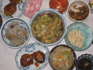 食:20時、五穀ご飯、味噌汁、白菜と豚肉の重ね煮、千切りじゃが芋サラダ、まぐろキムチ、かぼちゃ煮、納豆、キムチ。