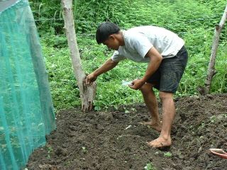 | 2003年6月、台風が到来している中リトル・タジャンを訪問した。以前に比べタジャンの道路事情は良くなってきているが、相変わらず雨が降ると所々ぬかるみ、今回も数回車が立ち往生し引き出すのに1時間以上かかった。 今回の滞在中、雨が降っていることが多かったがそれでも晴れ間をみて育苗場で作業を行った。育苗場全体に雑草が繁茂しており、バイオマスの豊富さに感心しつつまずはその除草作業を行った。今年3月に播種した柑橘の種子は、予想通り発芽率は低く20%程度であった。発芽したものは10〜15cmに成長していたが、防虫ネットを設置したにもかかわらずアゲハチョウの幼虫による食害に侵されているものが多く見られた。定期的に見回りをして、手で幼虫を取り除けばよいと思うがまだそこまでの意識はないようである。害虫対策としてニームを使ってみるようにジュリオスに提案した。ニームについての情報は多く見られるが、実際の効果を見るのに良い機会である。除草を終えた後、マンゴー、アボガド、ニーム、グアバノ、アカシア、ジミリーナ等を新たに播種した。これらの種子のほとんどは各人が採取や食後に保存したものであり、果樹の種子はプラスチック・ポットに、アカシア、ジミリーナ等の種子は発芽しやすく、害虫がつかないこともありネットの外にシード・ベットを作り播種した。人気のあるマンゴーは、数百個の種子が集まり用意したプラスチック・ポットが足りず、残りはやはりシード・ベットに植え、発芽後移植することにした。 育苗場の害虫対策、除草等の管理はまだ十分に行われておらず、自主的に行うようになるにはもう少し時間がかかると思われる。このプロジェクトに最も理解を示し、育苗の技術も持っているジュリオスが仕事の関係上、村を離れていることが多いのは残念なことである。しかし種子を集めることに関心を持つようになったことなど多少変化が現れてきている。またこれまでこのプロジェクトにあまり関心を示さず、積極的に係わってこなかったサイモン(ジュリオスの長兄)が今回熱心に手伝ってくれ、個人で育苗するためにプラスチック・ポットを持ち帰っていた。後で訪ねてみたところ、自宅の庭に小さな育苗場を作り、ジュリオスに柑橘の接ぎ木の仕方にを習っている姿が見られた。 このように少しずつではあるが、村民の育苗や植林に対する意識は変わってきているように思われた。 今後も育苗場を発展させつつ、村民の関心を高めていきたいと思う。